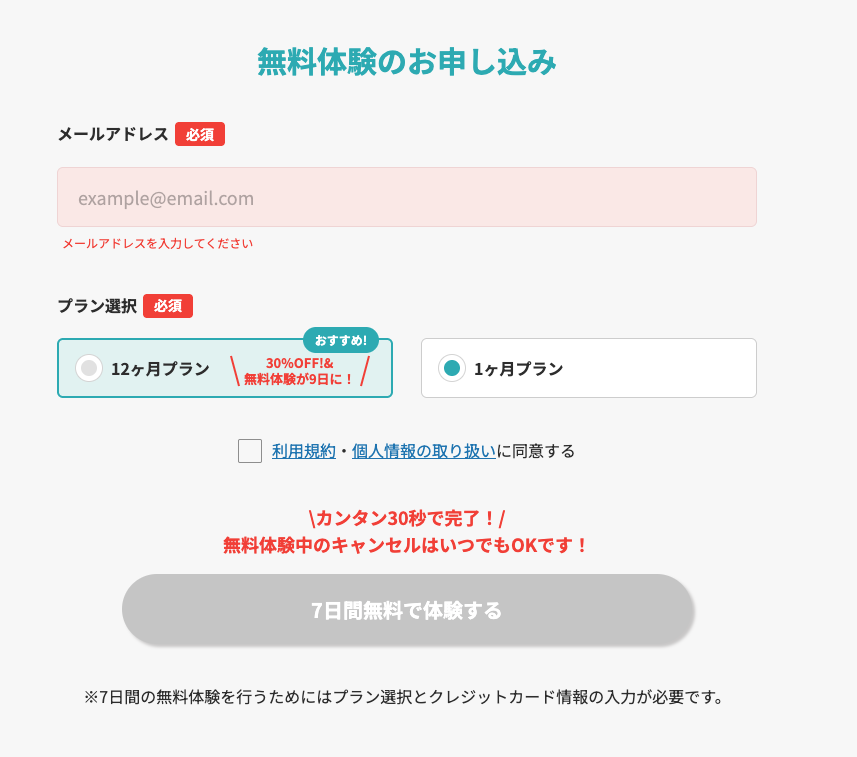 12ヶ月プランは1ヶ月プランを12ヶ月継続した場合と比べ約30%お得で、Web申し込みがおすすめ。 どちらも7日間無料体験が可能で、解約しても体験期間は利用できます。