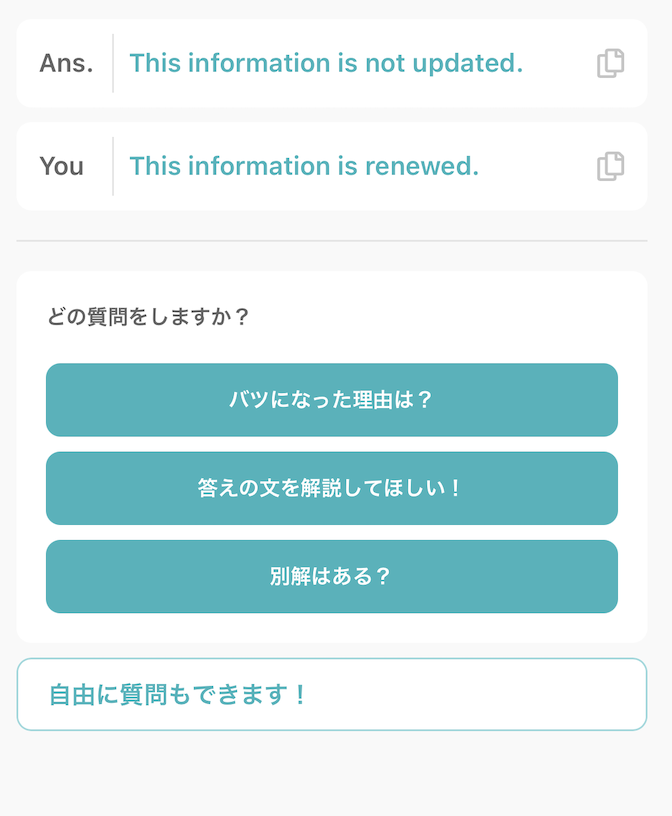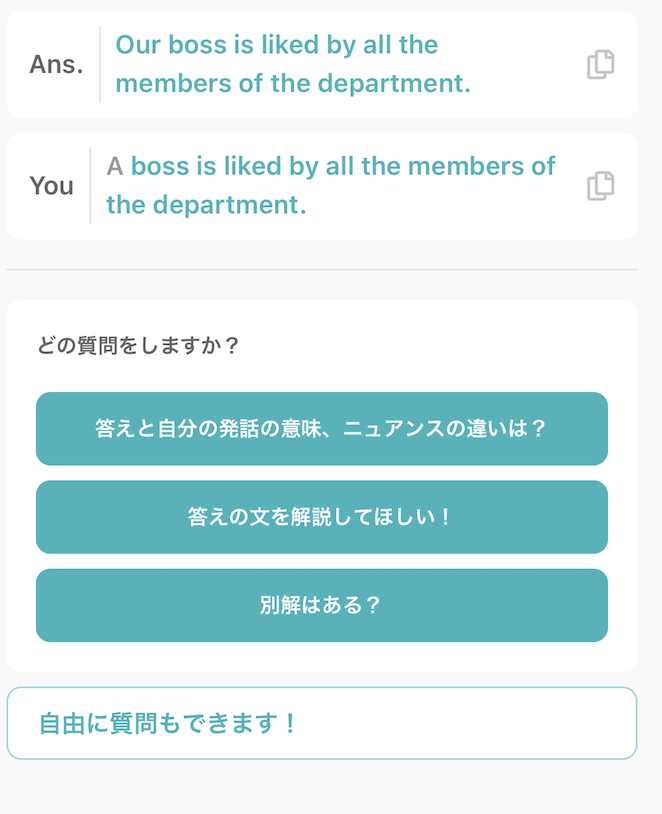 さらに、判定は“模範解答と完全一致”にこだわらず、正解の場合は解説や別解、ニュアンス違いは違いの説明、不正解はどこがどう違うのかまで示されるため、自分の弱点が具体的に分かります。