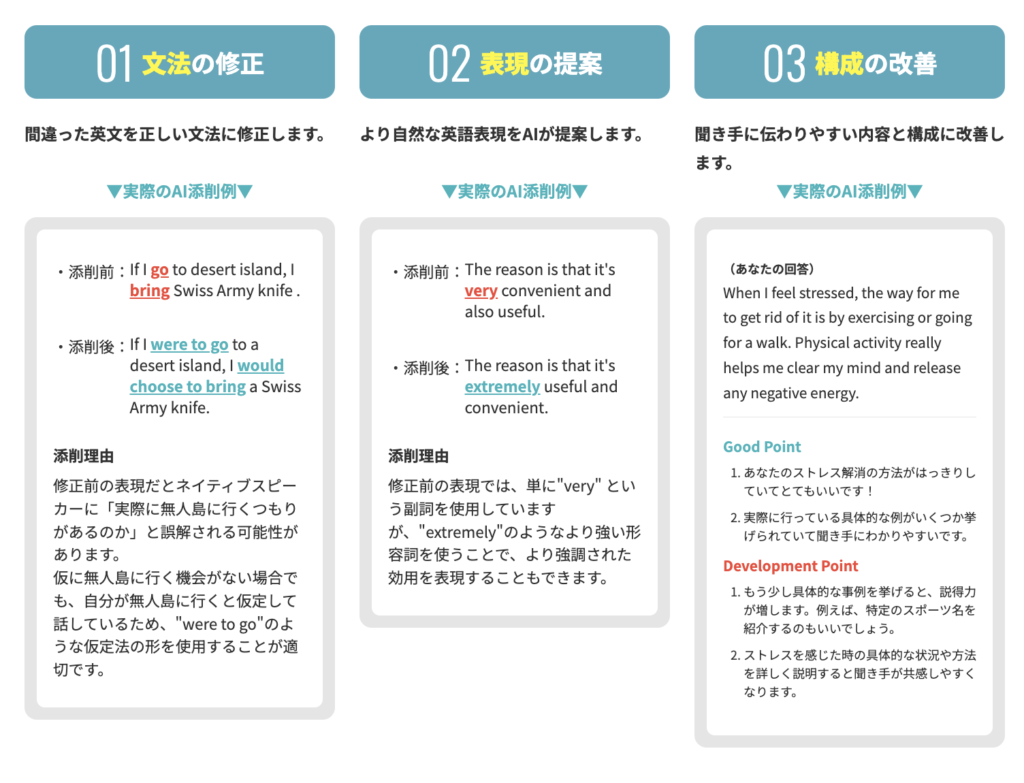 - 話し終えた内容に対して、文法・表現・構成の観点で改善案を提案してくれる