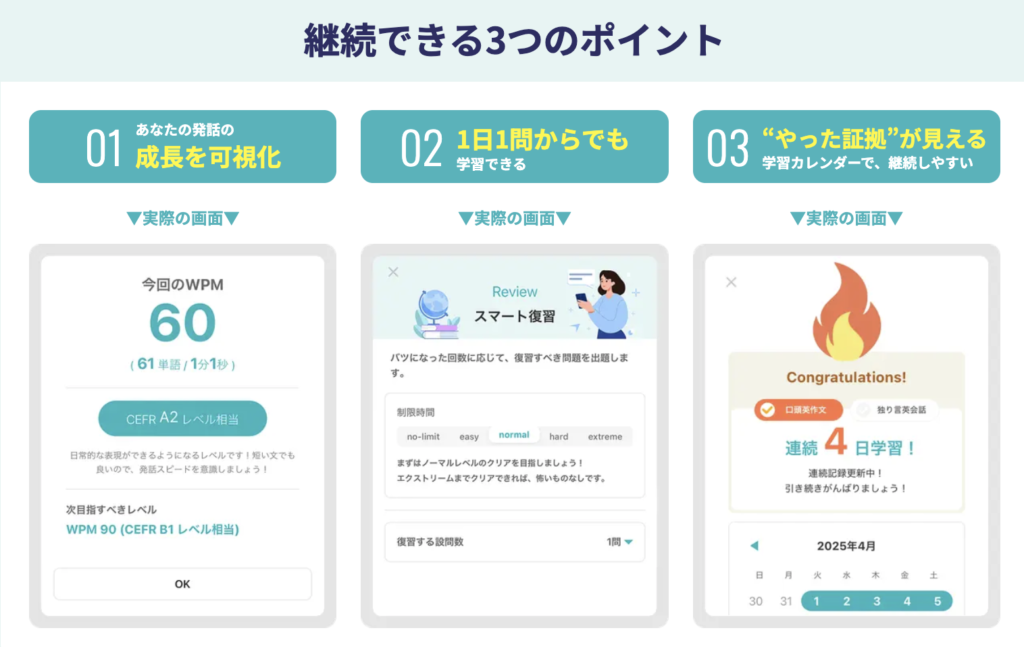 やることは「日本語→英語で口に出す」だけなので継続しやすく、さらにAIが即判定することで、話しっぱなしで終わらず、ミスをその場で修正できる学習設計になっています。